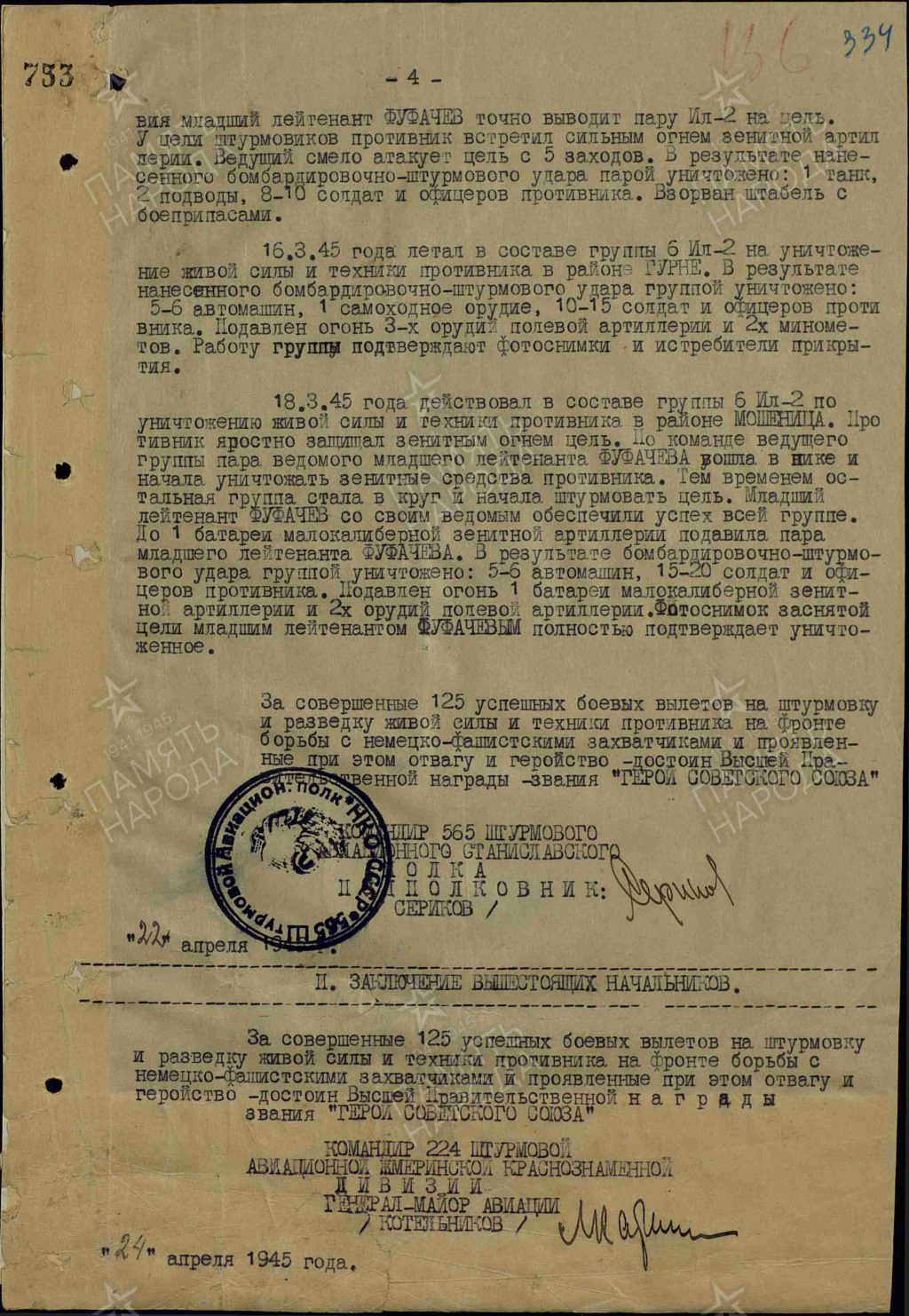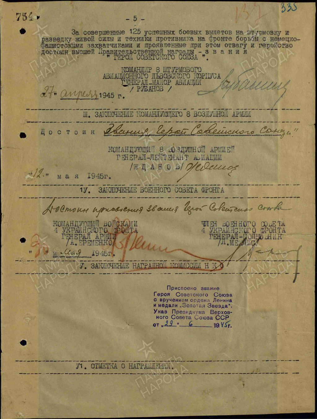 К апрелю 1945 года совершил 125 боевых вылетов на штурмовку и разведку живой силы и техники противника, нанеся врагу значительный урон. 19 апреля был представлен к присвоению звание Героя Советского Союза.