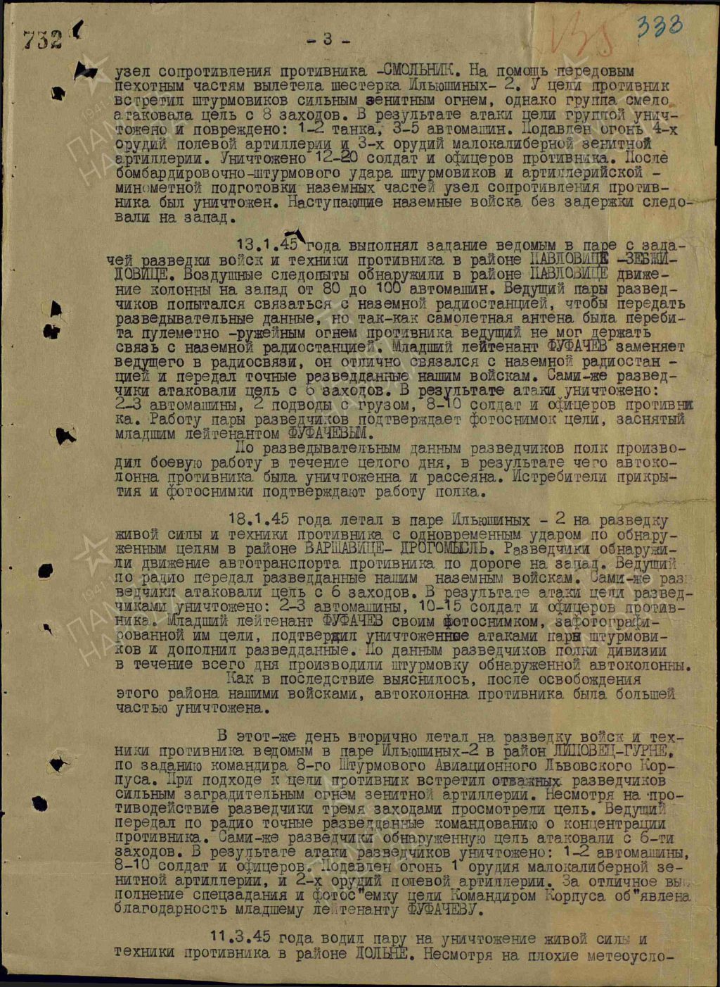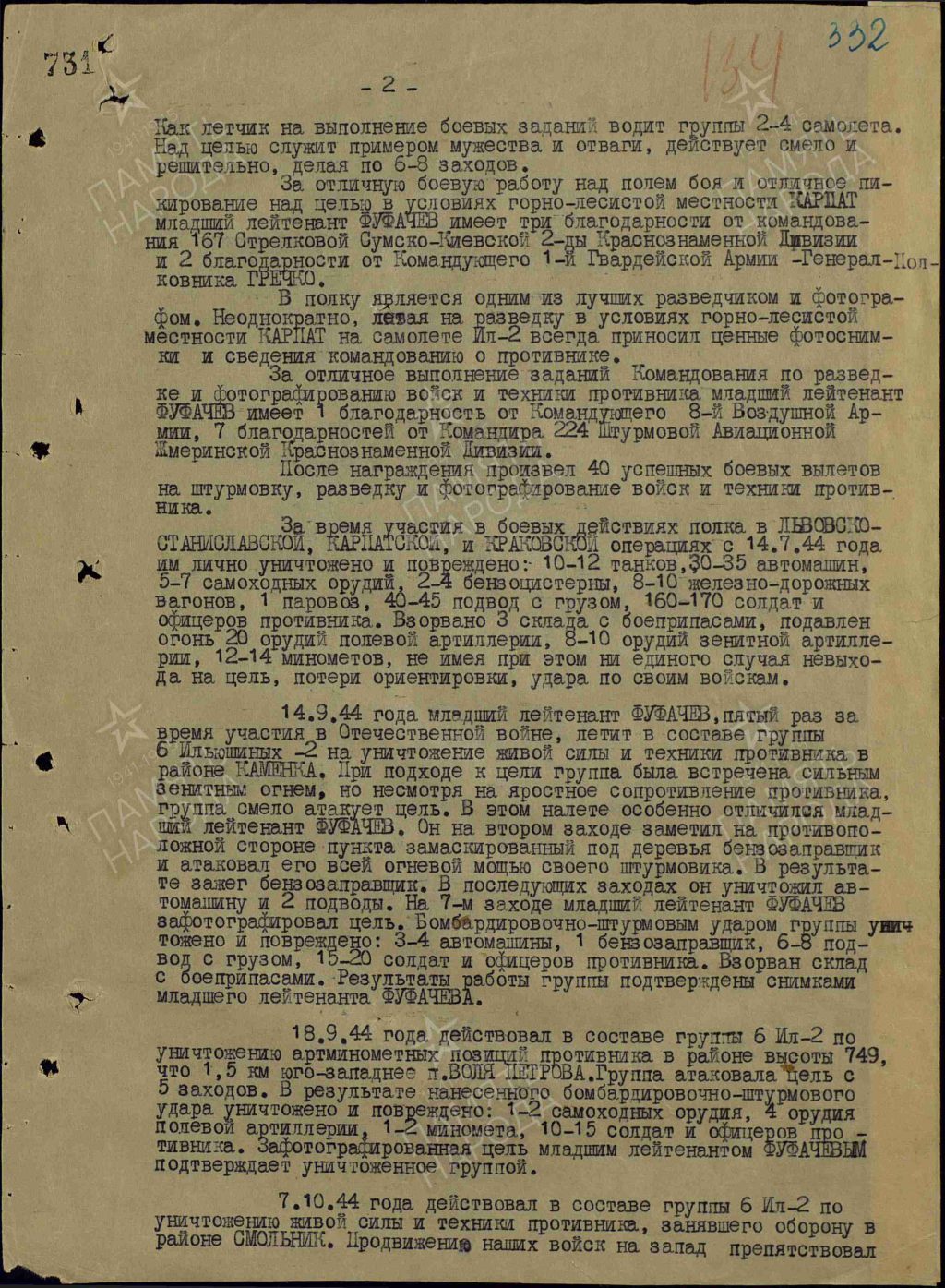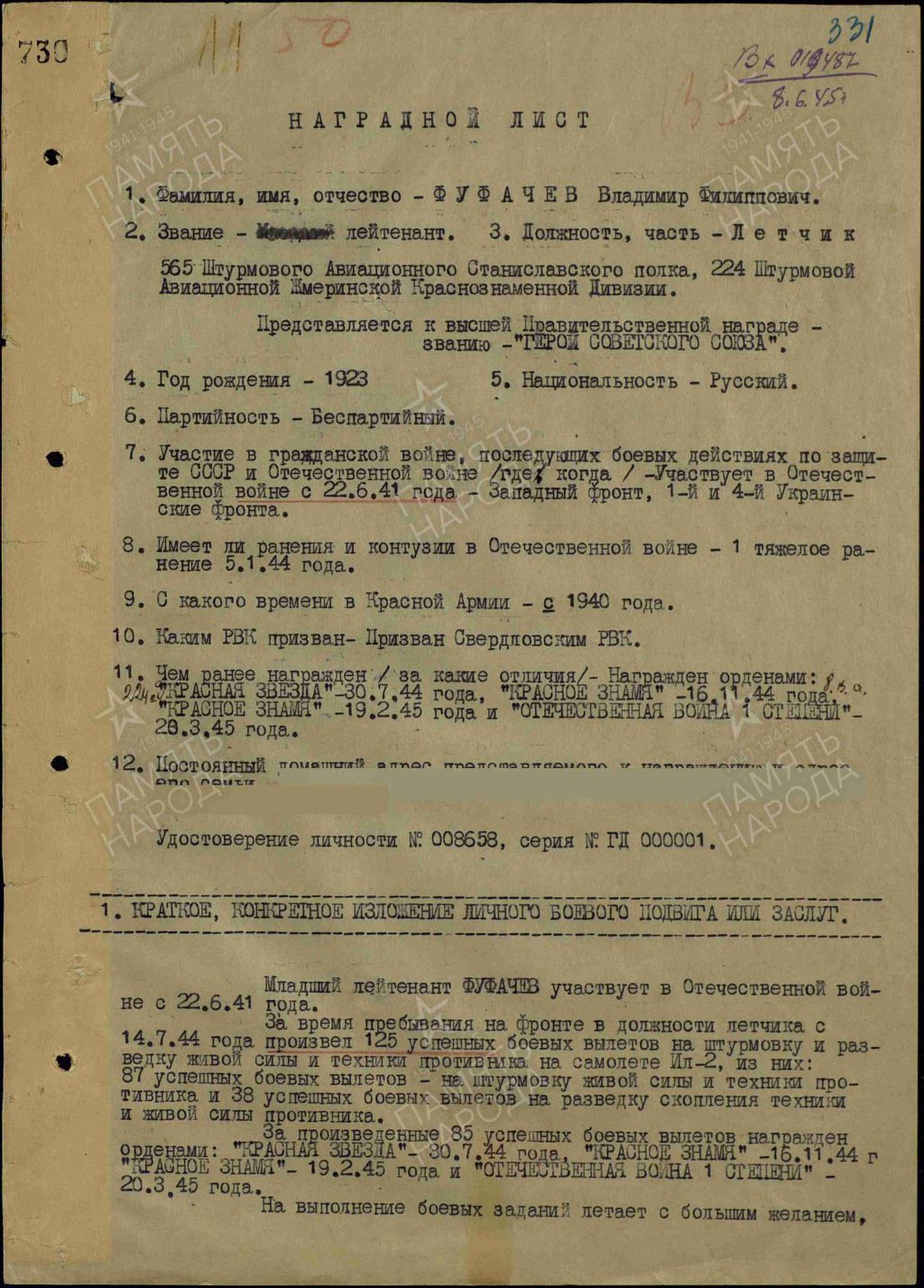 Фуфачев Владимир Филиппович – лётчик 565-го штурмового авиационного полка (224-я штурмовая авиационная дивизия, 8-й штурмовой авиационный корпус, 8-я воздушная армия, 4-й Украинский фронт), лейтенант.