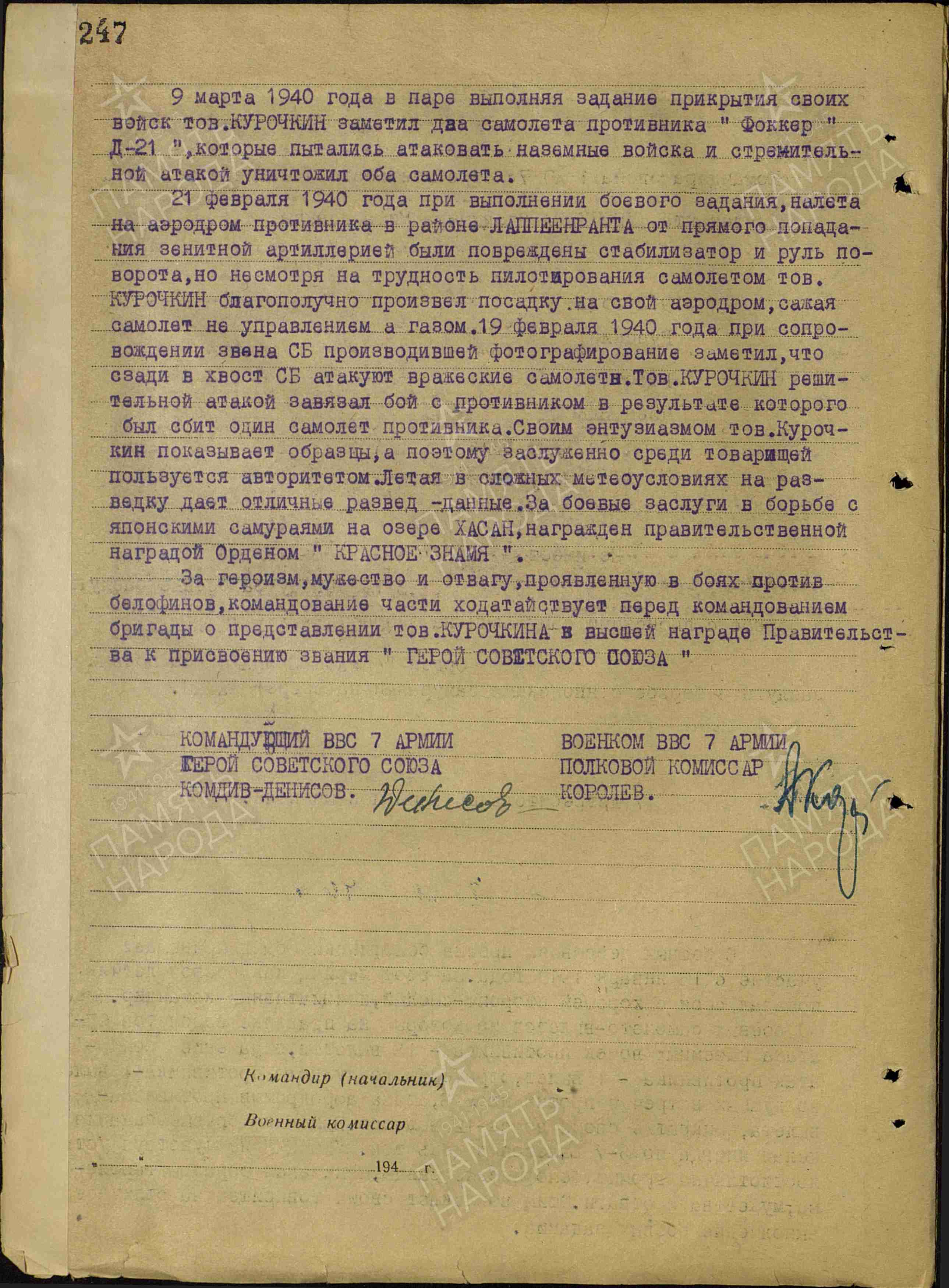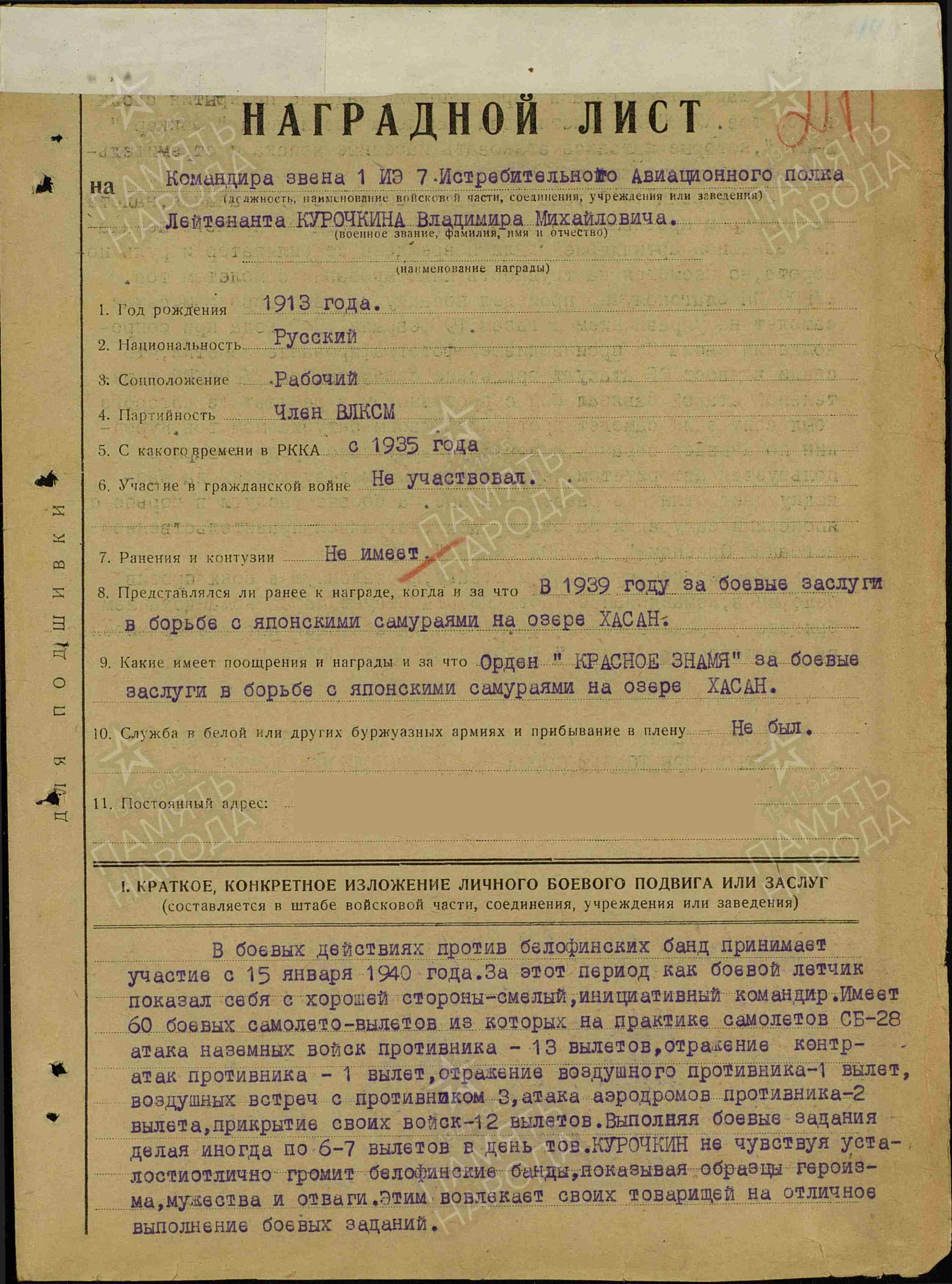 Командир звена 7-го истребительного авиационного полка старший лейтенант В.М. Курочкин произвел 60 боевых вылетов на штурмовку наземных войск, в воздушных боях сбил 3 самолёта противника.