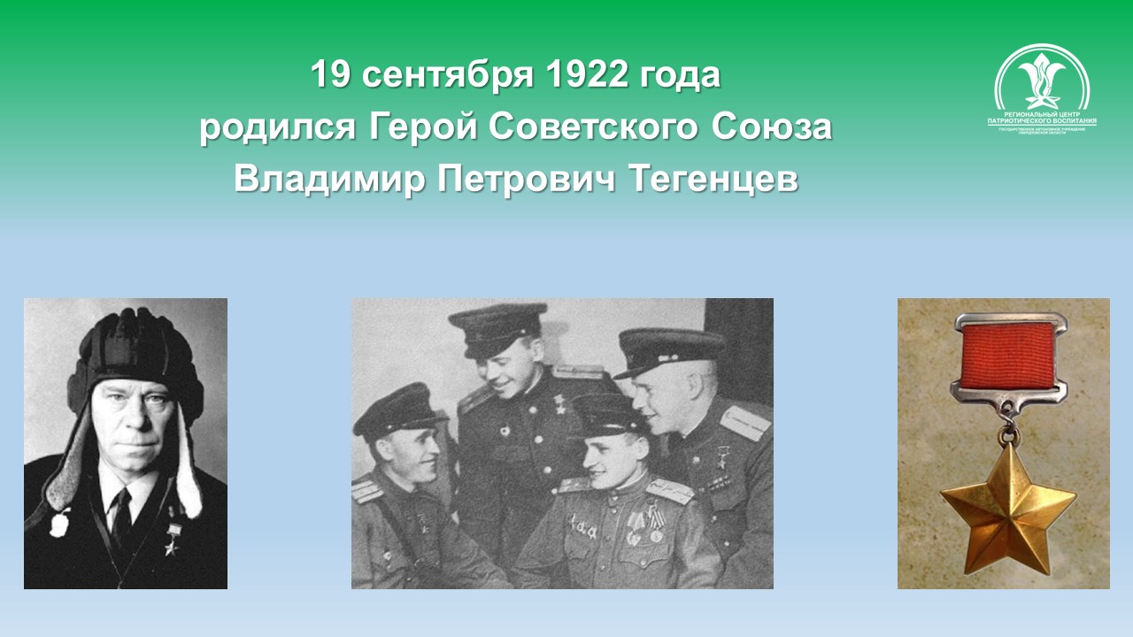 Указом Президиума Верховного Совета СССР от 27 февраля 1945 года за образцовое выполнение боевых заданий командования на фронте борьбы с немецкими захватчиками и проявленные при этом отвагу и геройство гвардии младшему лейтенанту Тегенцеву Владимир Петровичу присвоено звание Героя Советского Союза с вручением ордена Ленина и медали «Золотая Звезда».