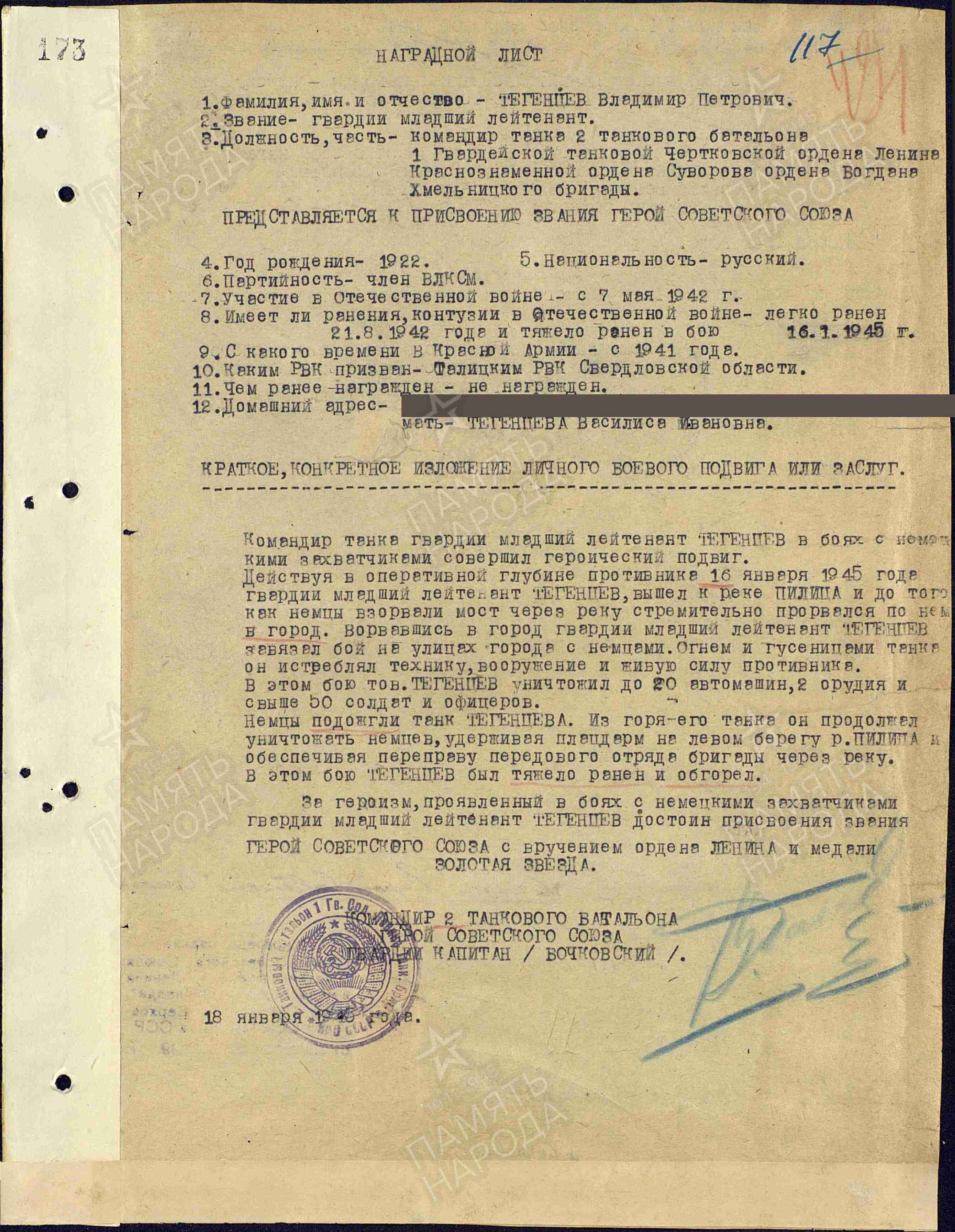 Тегенцев Владимир Петрович - командир танка 1-й гвардейской танковой бригады (8-й гвардейский механизированный корпус, 1-я танковая армия, 1-й Белорусский фронт), гвардии младший лейтенант.