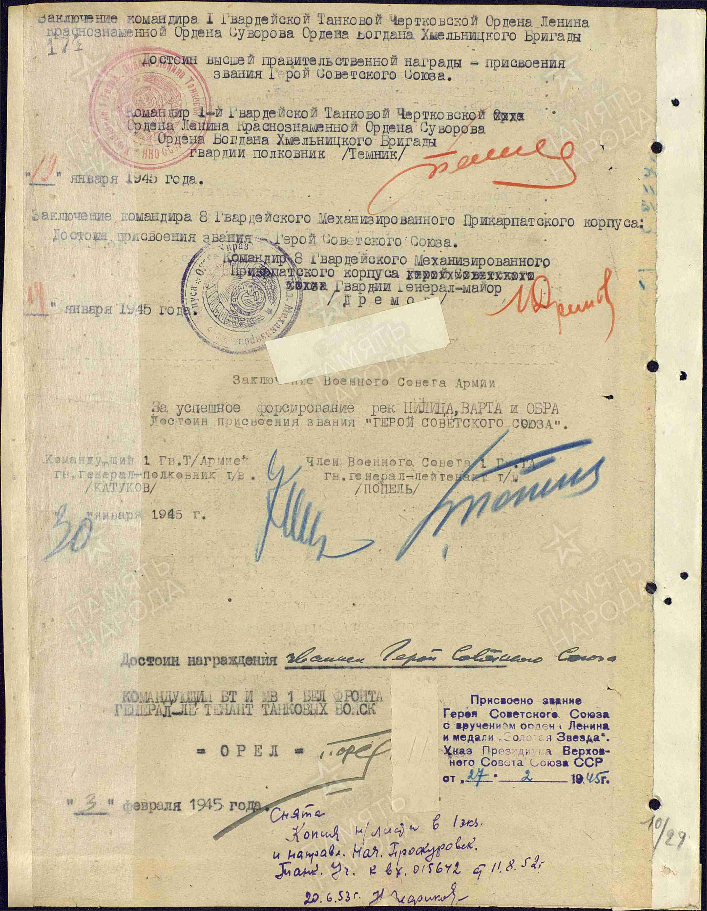 Особо отличился в боях по освобождению Польши: 16 января 1945 года танкисты вышли к реке Пилица, затем завязали бой на улицах города Нове-Място. Гитлеровцы подожгли танк, но экипаж продолжал вести огонь, способствуя переправе передового отряда бригады через реку.