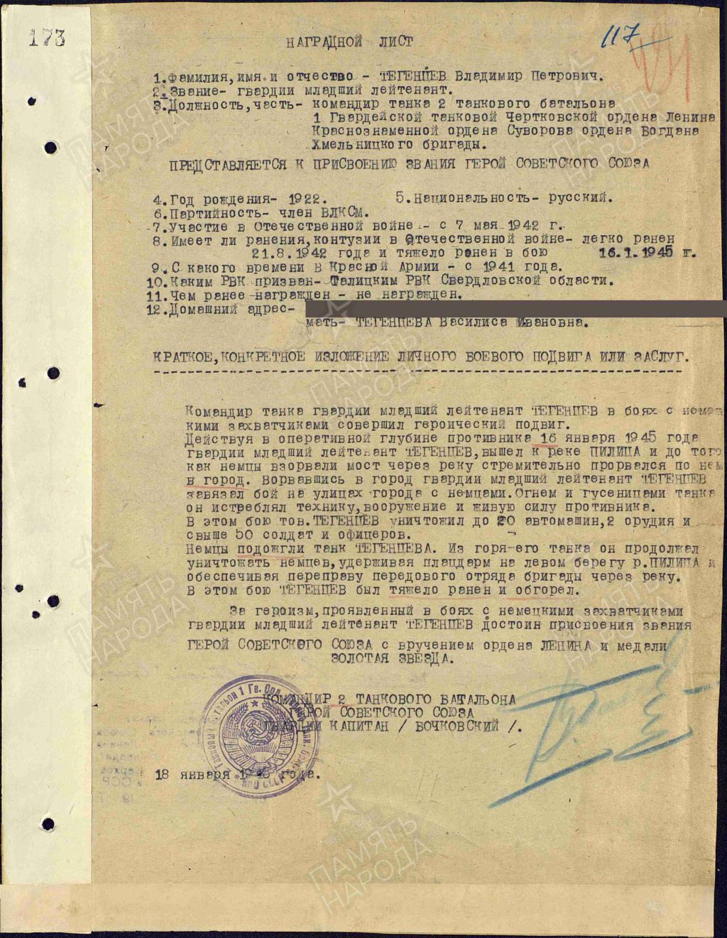 Тегенцев Владимир Петрович – командир танка 1-й гвардейской танковой бригады (8-й гвардейский механизированный корпус, 1-я танковая армия, 1-й Белорусский фронт), гвардии младший лейтенант.