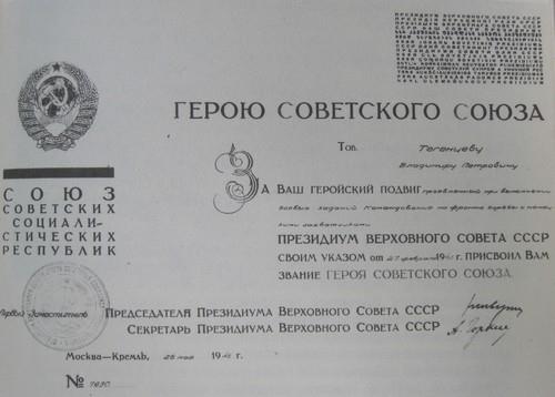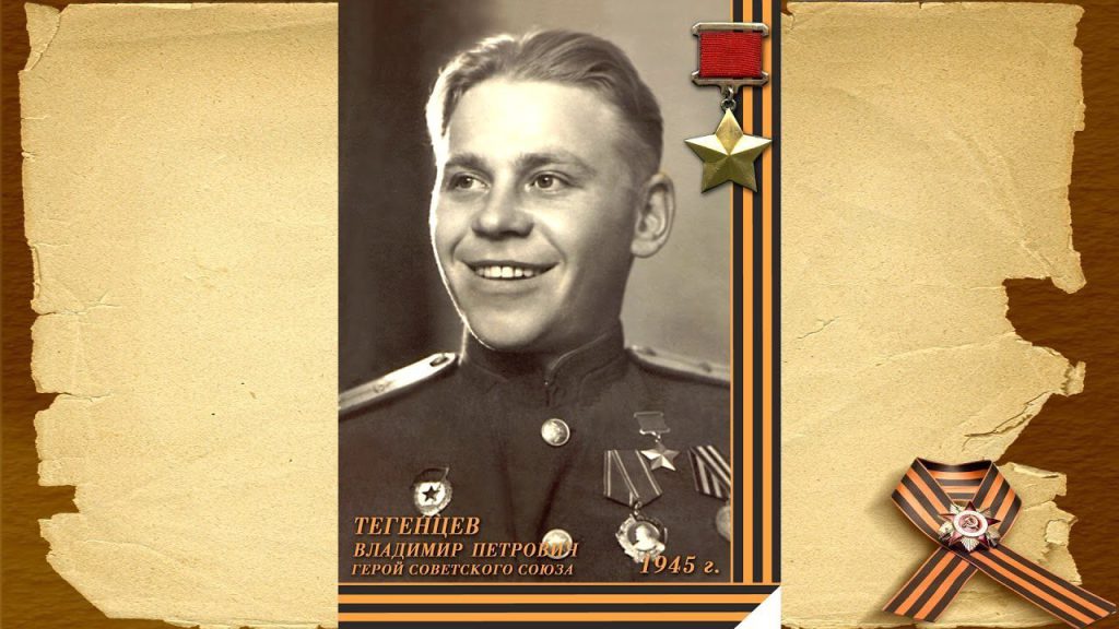Указом Президиума Верховного Совета СССР от 27 февраля 1945 года за образцовое выполнение боевых заданий командования на фронте борьбы с немецкими захватчиками и проявленные при этом отвагу и геройство гвардии младшему лейтенанту Тегенцеву Владимир Петровичу присвоено звание Героя Советского Союза с вручением ордена Ленина и медали «Золотая Звезда».
