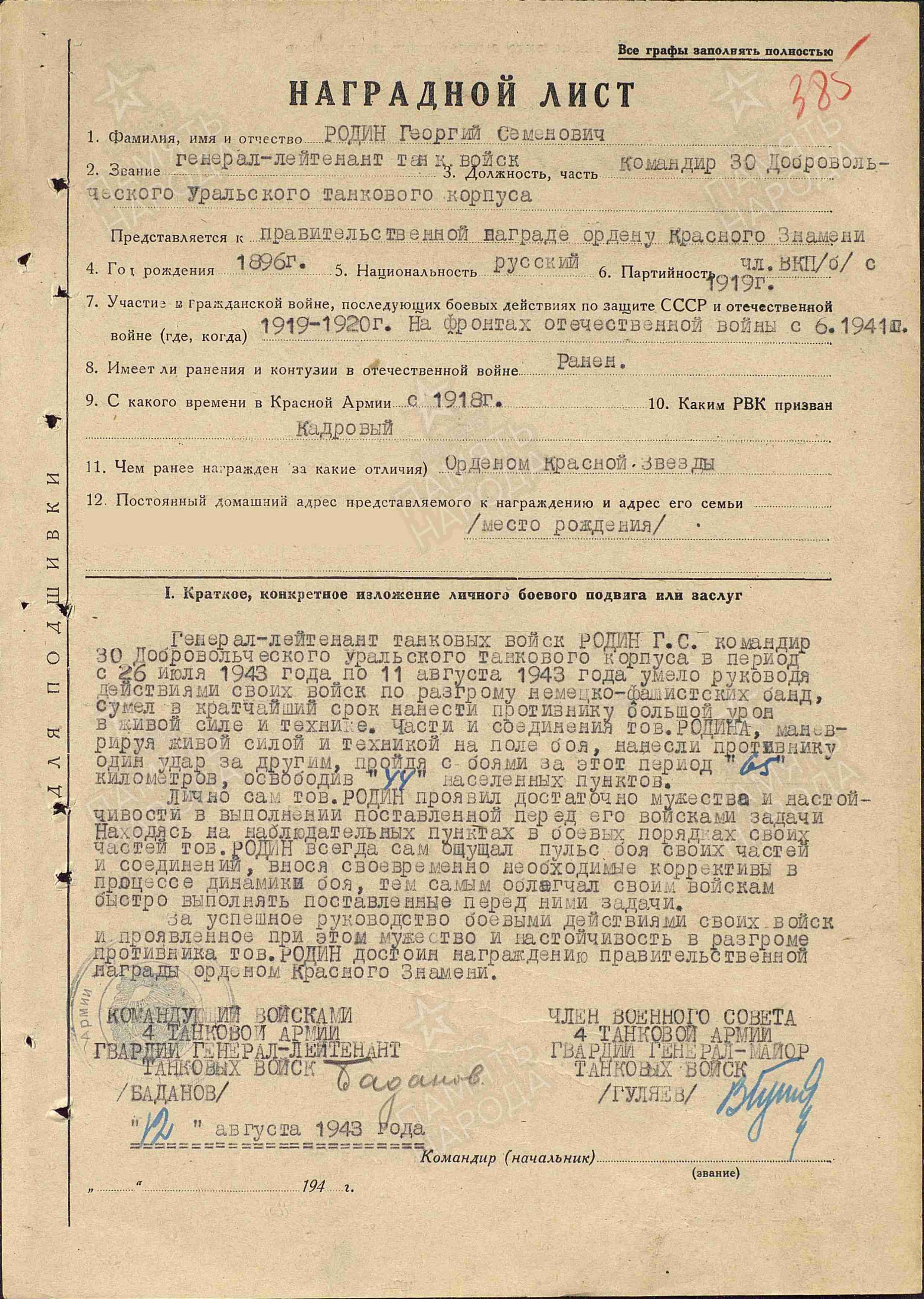 С октября Г.С. Родин начальник АБТВ Юго-Западного фронта, с апреля 1943 г. командир 30-го Уральского добровольческого танкового корпуса, который находился в резерве Ставки ВГК, а с июля - в составе 4-й танковой армии Западного, а с 30 июля 1943 г. - Брянского фронтов и принимал участие в Орловской наступательной операции.