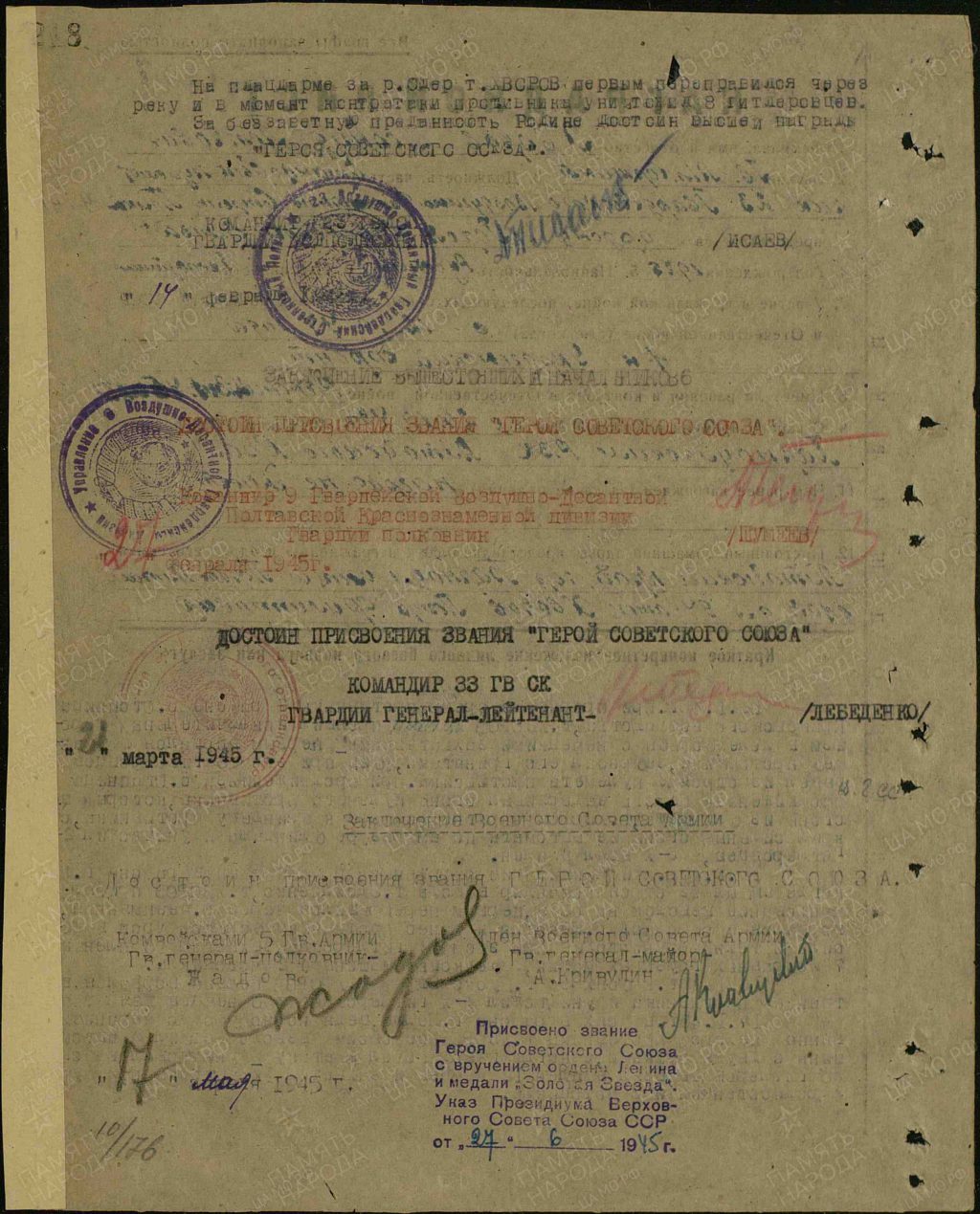 Указом Президиума Верховного Совета СССР от 27 июня 1945 года присвоено звание Героя Советского Союза с вручением ордена Ленина и медали «Золотая Звезда».
